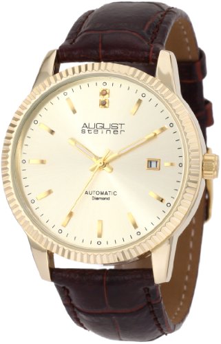 This August Steiner men 's automatic diamond watch, features sunray silvertone dial with genuine diamond. Watch, features a date with a highly polished goldtone coin edge bezel, and brown genuine leather strap, making it perfect for any occasion. This August Steiner men's automatic diamond watch features, sunray gold with genuine diamond. Watch, features a date with a highly polished goldtone coin edge by August Steiner Men's ASA825YG Diamond Automatic Strap Dress Watch